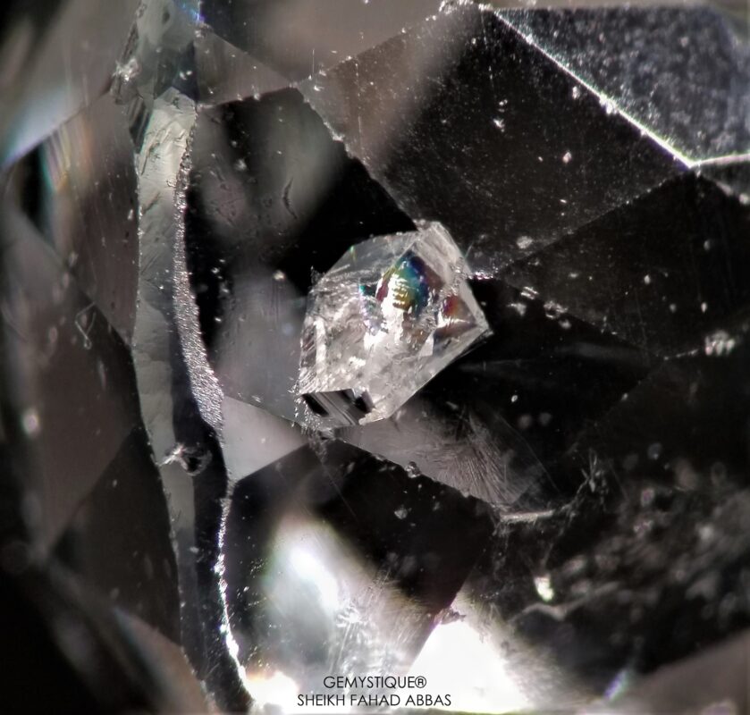 As beautiful as the inclusion itself is, the photomicrographs however are taken with the intention to capture the very interesting growth conditions around it. The area beneath the large crystal has eye visible strain/stress and tension. Accompanied by small mineral xtls, the photomicrographs capture the depth of these stressful growth conditions caused by the large mineral inclusion, from different angles and positions. The disruption and continuation in the growth process of the host mineral and the resulting anomalies paint a fascinating picture. Almost as if a large meteoroid traveling through space is followed by its long debris tail.
