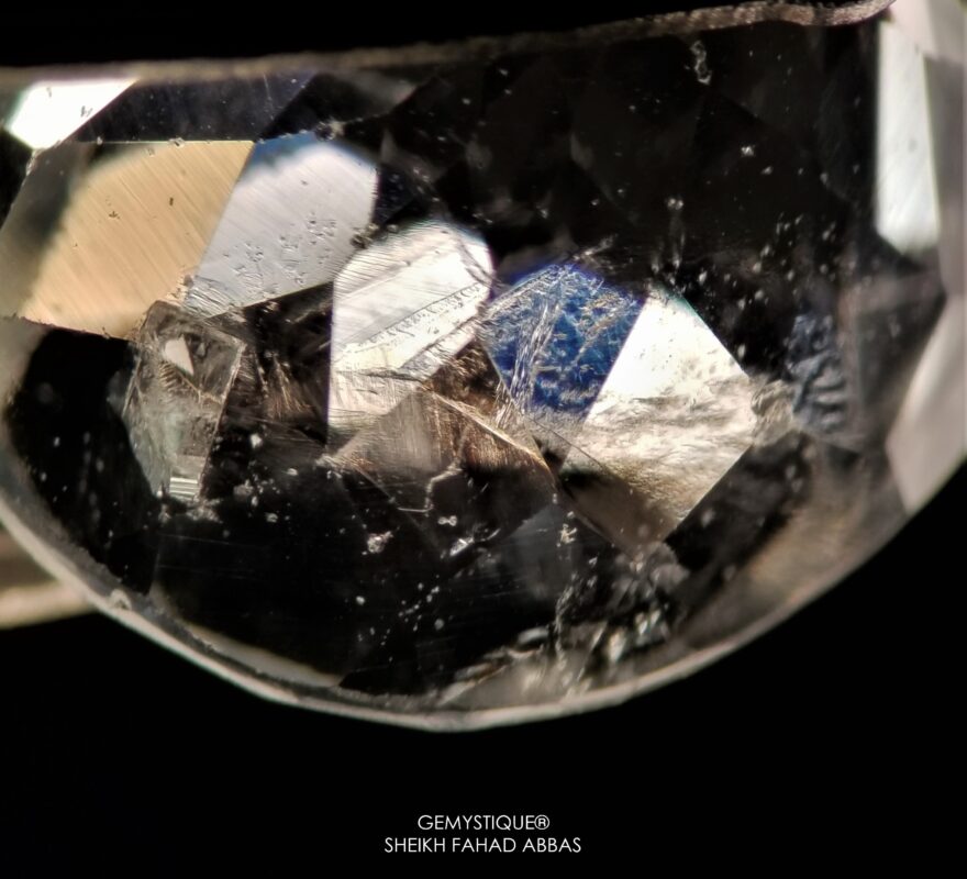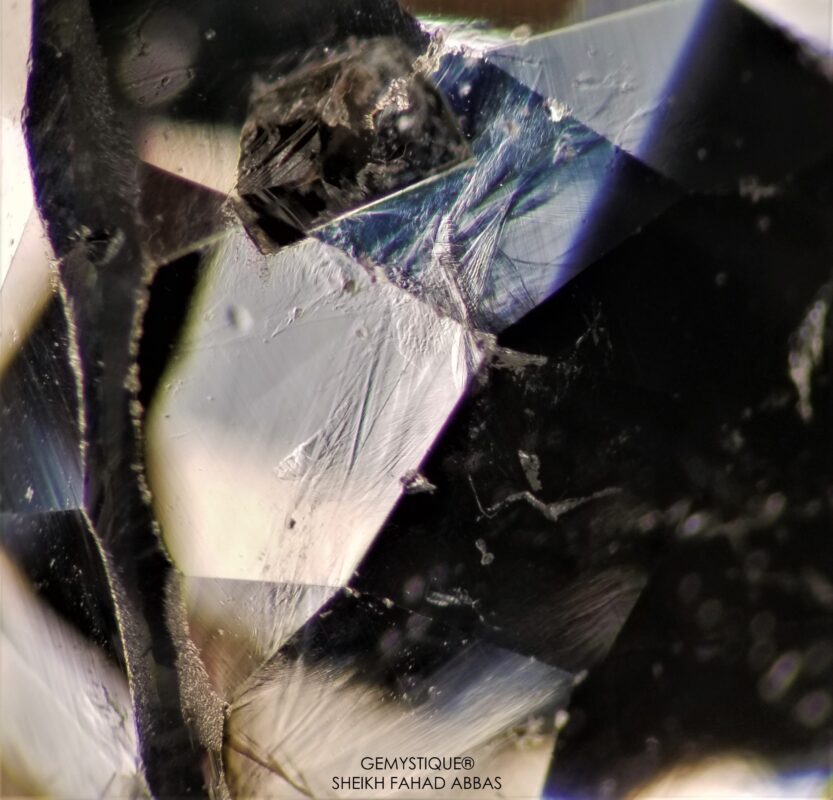 A very interesting examination for this weeks microscopemonday. Looking at a considerably large mineral inclusion trapped within a Pakistani Aquamarine. While there are several known mineral inclusions associated with Pakistani aquamarine, Feldspar, Quartz, Mica in various forms like Muscovite etc. white to transparent and colorless Albite crystals, just to name a few, this particular inclusion could not be identified with standard gemological examination alone. Often, there are various possibilities for one guest mineral and in spite of some clues, one should always be circumspect while giving identity calls without adequate gemological evidence.