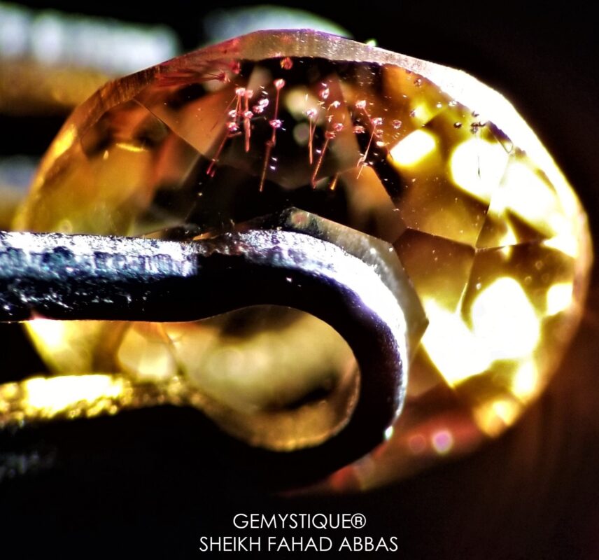 Examining a very interesting combination of inclusions in Citrine this week. What we see here are hematite needles with multi-spine hematite inclusions on top of these needles. Both hematite needles and multi-spine hematite inclusions can also be found separately in Amethyst and Citrine.