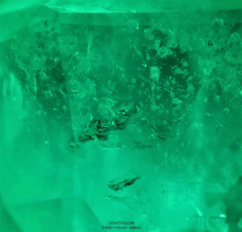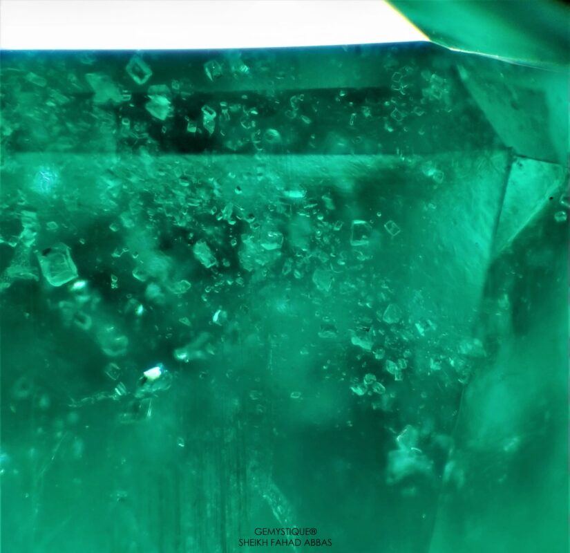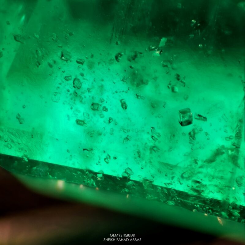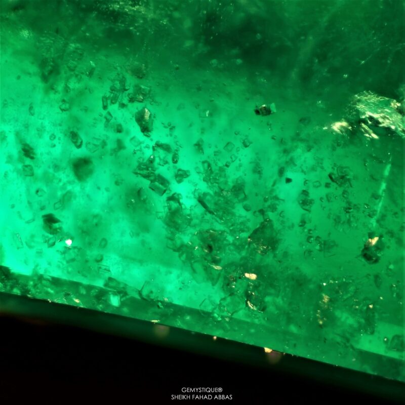 Swat emeralds are renowned for their rich vivid hues and their beautifully interesting microworld of inclusions. One particularly interesting type of inclusion that can be observed in emeralds from the Swat area of Pakistan are clusters of numerous colorless mineral crystals