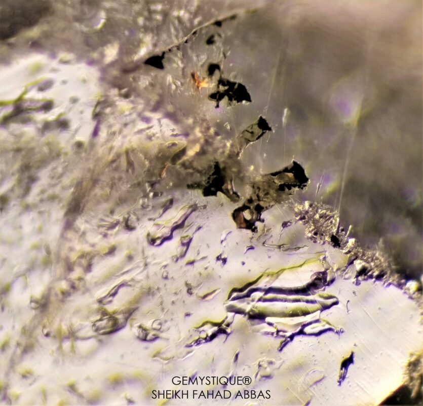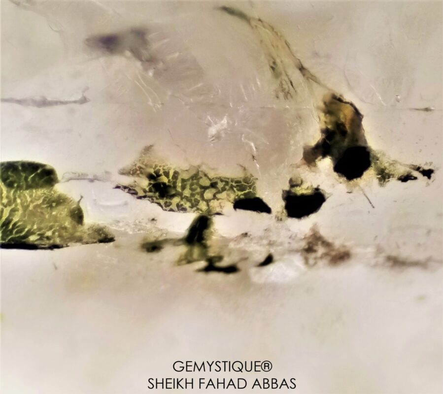 Several 2 and 3 phase inclusions can be seen in the first photo. One surface reaching break has resulted in unidentified external green matter to penetrate the fissure that has eventually dried out. The foreign matter has penetrated almost halfway into the fissure as the other part remains intact and clean. The alien matter can be seen in other photos as well and after drying out it has created dendritic patterns in some areas. Yet again, numerous classic examples of ‘Epigenetic Fluid Inclusions’.