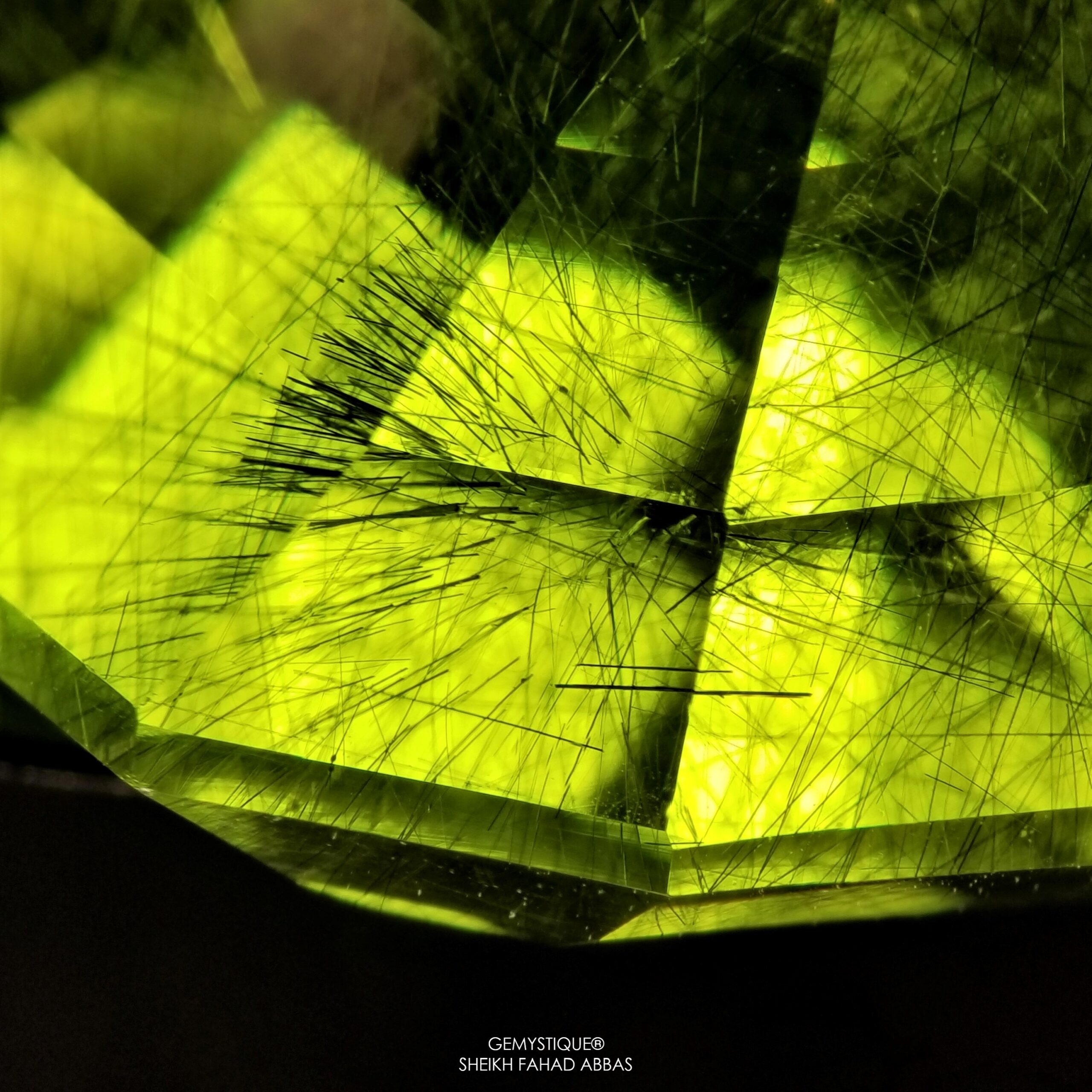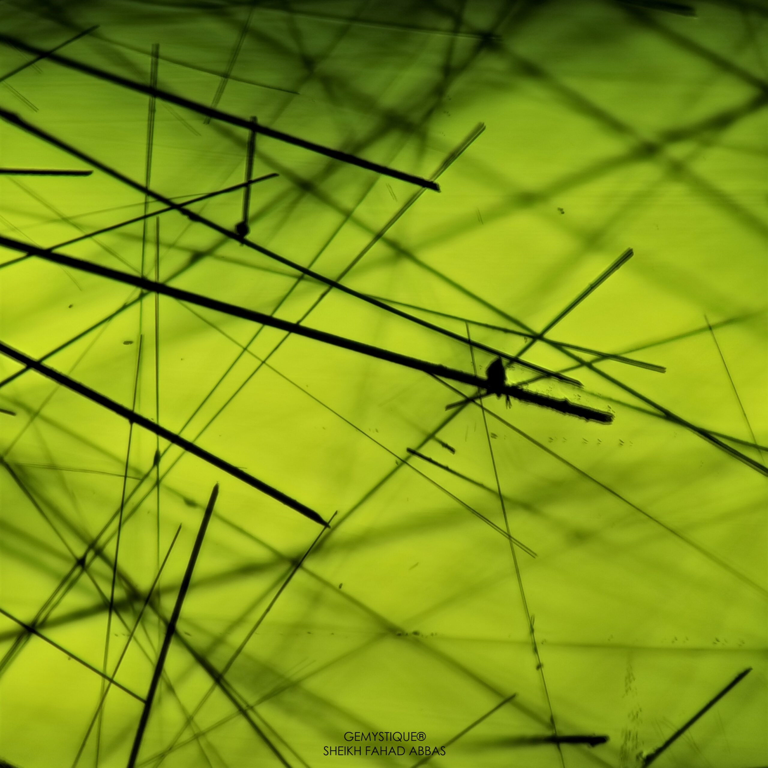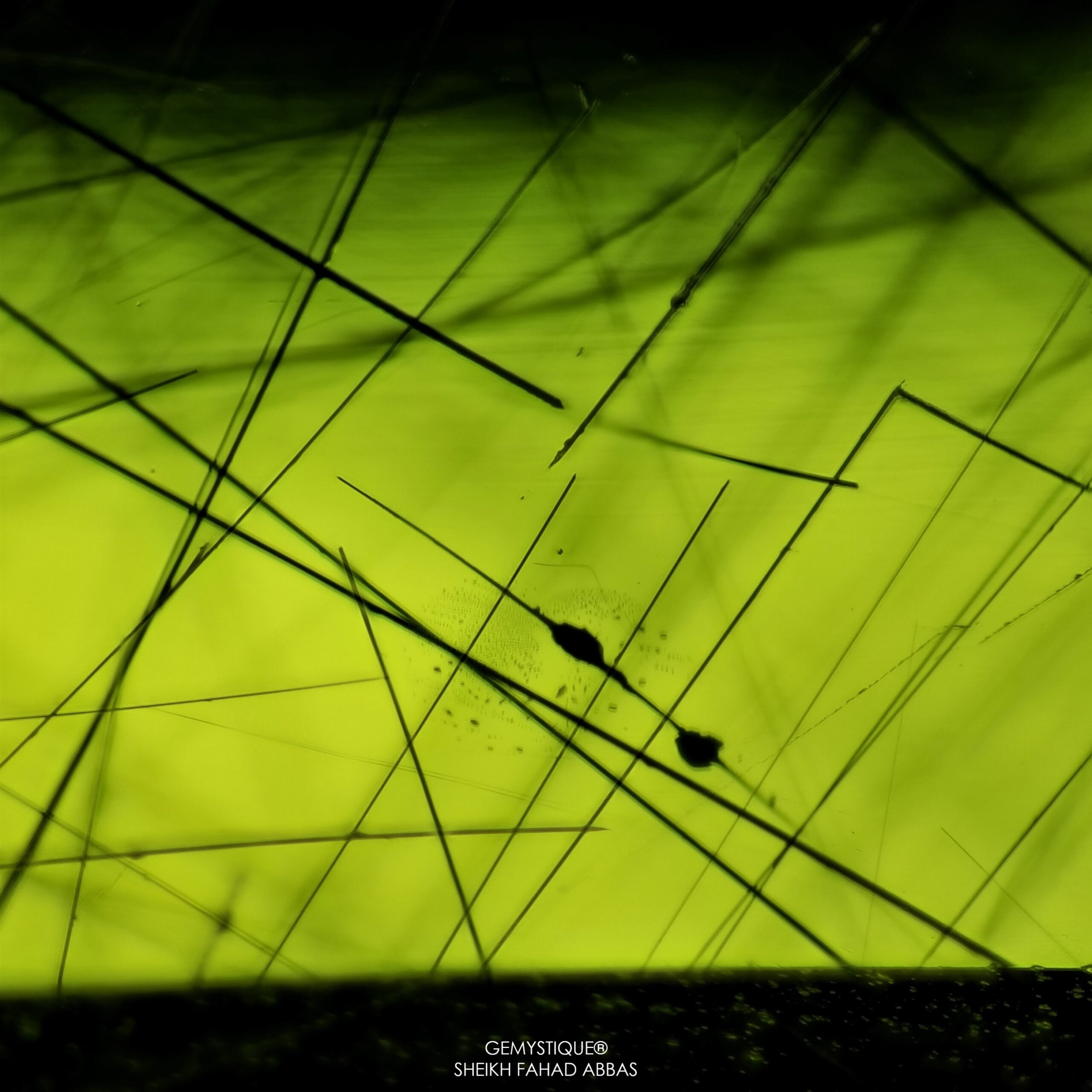 Same is the case at hand, examining a beautiful 53ct monster Peridot from Pakistan that has Ludwigite-Vonsenite Needles and yellow fibers beautifully oriented throughout the stone. Photomicrographs display their varying and mystical appearance encompassed within a vividly saturated host