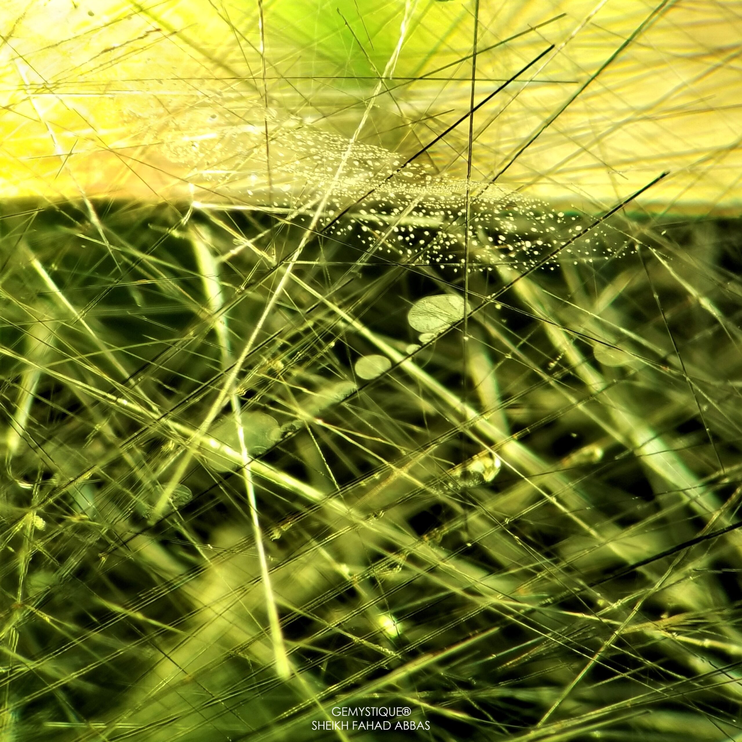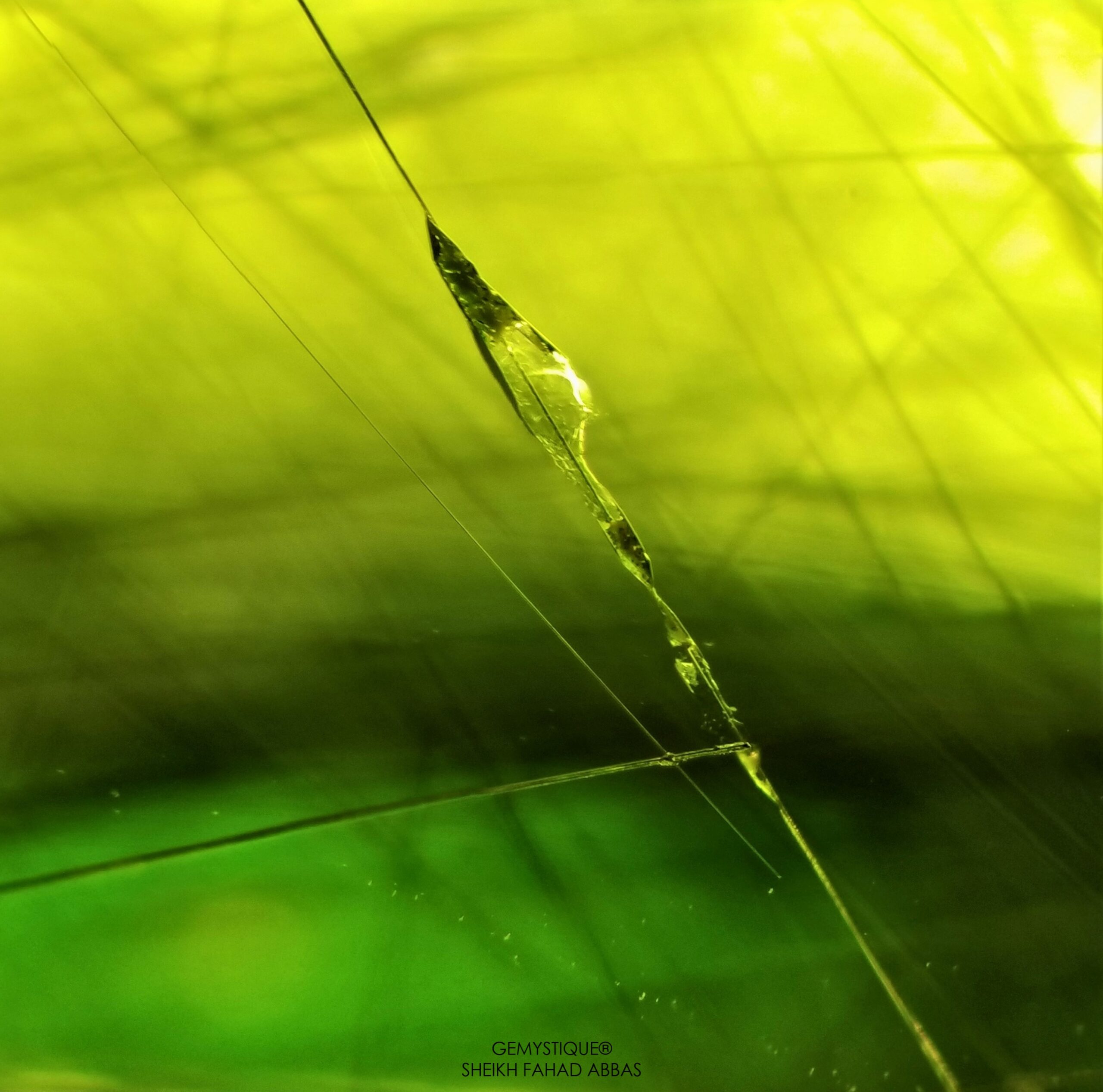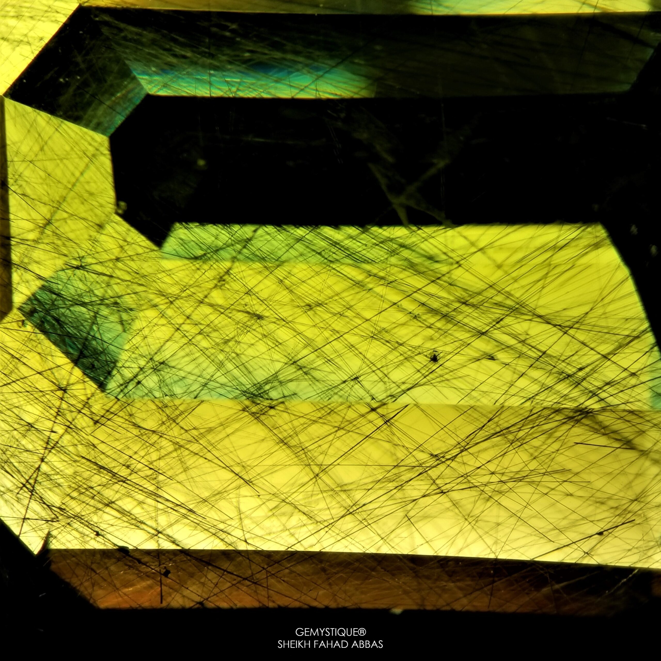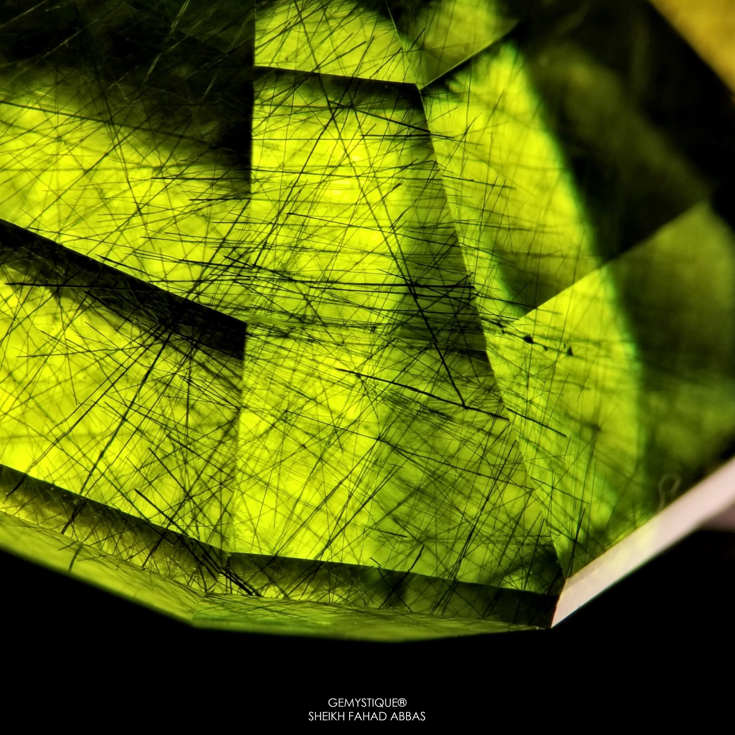 Same is the case at hand, examining a beautiful 53ct monster Peridot from Pakistan that has Ludwigite-Vonsenite Needles and yellow fibers beautifully oriented throughout the stone. Photomicrographs display their varying and mystical appearance encompassed within a vividly saturated host